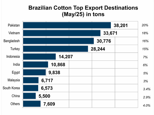 브라질은 최대 면화 수출국으로 부상했다. 2020~21년 22%에서 2023~24년과 2024~25년 미국을 제치고 각각 28%, 30% 점유율로 면화 수출 1위를 기록했다. 또한 전 세계 면화 생산량의 14%(370만 톤)를 차지하고 있다. 생산량은 2019~2026년까지 연평균 13% 성장률을 기록할 것으로 전망된다. 2024-25년 브라질 코튼의 주요 수입국은 중국과 베트남이 각각 23%, 20%, 파키스탄과 방글라데시가 16%, 12%로 뒤를 이었다.