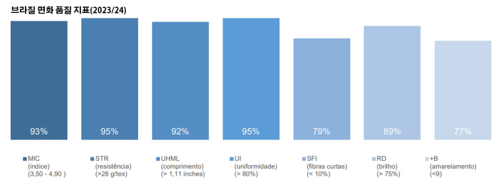 또한 브라질 면화 생산량 중 섬유장(UHML)이 29㎜(15/32인치)를 초과하는 비율이 72% 이상이다. 이 중 12%는 30.5㎜를 초과한다. 이러한 비율은 2015년 31%에서 2024년 72%로 증가했다.