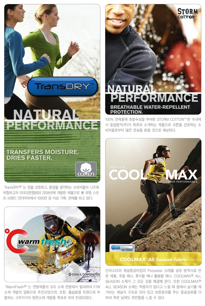 특히 ▲흡습발열의 기능성 섬유인 ‘Warmfresh’ ▲흡한속건의 기능성 친환경 코튼소재 ‘TransDry’ ▲대나무를 소재로 한 ‘BamBooSil’ ▲해초를 소재로 한 ‘SeaCell’ 등 에너지 소비를 줄일 수 있는 친환경 소재 개발에 주력하며 각종 의류에 상용화하는데 이바지하고 있다. 또한 환경오염 문제를 해결한 100% 무공해 재생섬유인 텐셀(Tencel)과 모달(Modal)의 소비 확산에도 많은 기여를 하고 있다.