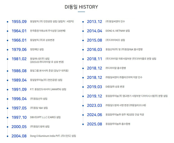 8월 4일 동일알루미늄과의 합병을 완료하면서 ▲동일씨앤이 ▲디아이비즈 ▲플라즈마텍 ▲디아이시스템 ▲P.T 동일인도네시아 ▲DIB-이집트 ▲동일알루미늄-인디아 ▲동일-베트남 ▲DIVISION MARKETING PROVENCE(DMP)▲플라즈마환보유한공사 등 모두 비상장사인 총 10개의 연결대상 종속회사이자 계열사를 두고 있다.